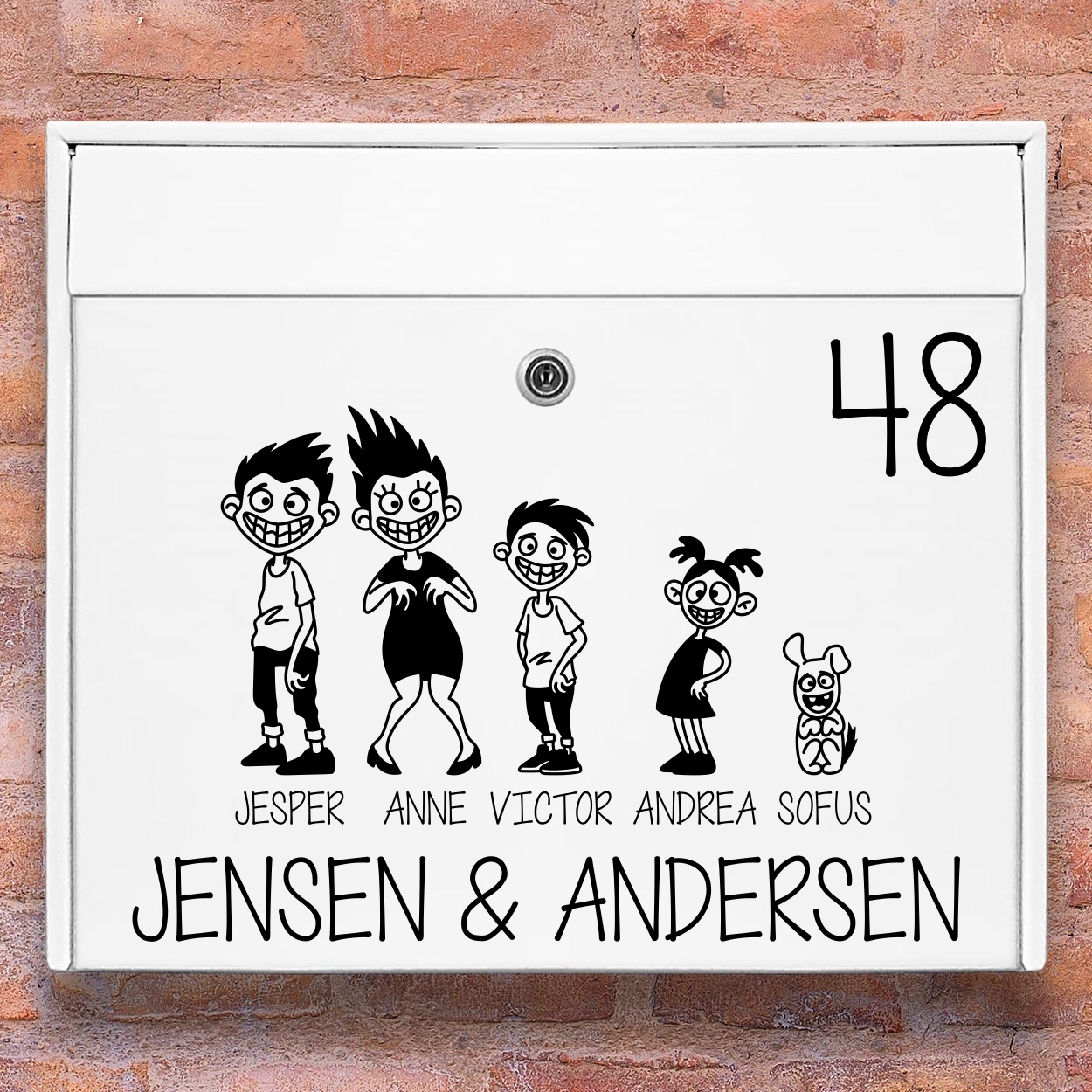 Vil du have en postkasse, der vækker smil hos både naboer og postbud? Med vores postkasse stickers i Crazy Familie-stilen kan du skabe et humoristisk og personligt udtryk, der skiller sig ud fra mængden. De skøre og karikerede figurer giver et legende twist og gør det nemt at vise, hvem der bor bag døren – på en anderledes og underholdende måde.